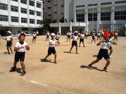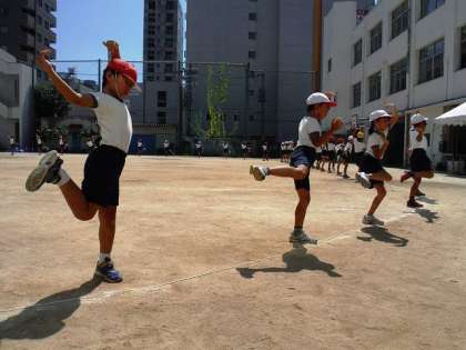 3年生と4年生がダンスの練習です。リズムに乗って体を動かして楽しそうに表現しています。