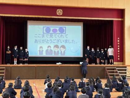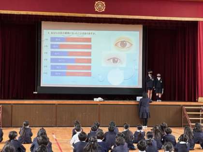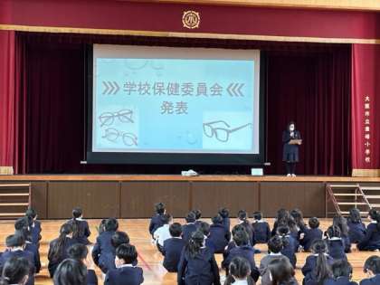 今日の集会は「学校保健委員会」の委員会発表でした。今日はみんなの視力に関しての発表です。アンケート結果から豊崎小学校では、学年があがるにつれて視力が悪くなっていることがわかりました。自分で気を付けることで、視力が悪くなるのを防ぐことができます。今日は自分たちで気を付けたらいいことを6つ教えてもらいました。