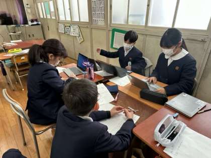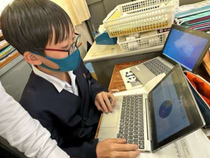 国語では資料をもとに、自分たちの考えを話あったり、伝えあったりしています。そして、今回テーマを決めて自分たちで資料をつくってプレゼンを作成していました。