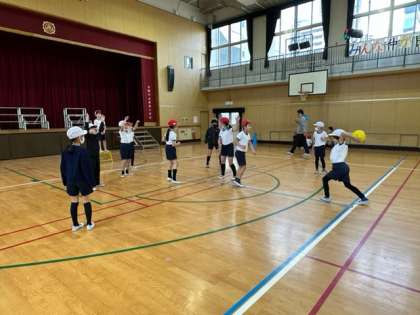 チーム対抗のゲームも行っています。でもなかなか点は入りません。どうやったら点がとれるかしっかり考えてゲームをしていきましょうね!