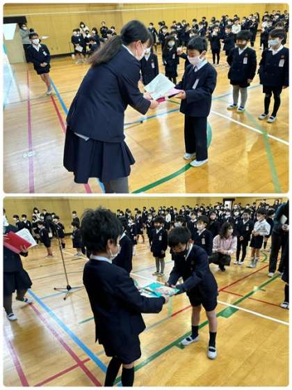 今日の児童朝会は2・3月生まれの「お誕生日集会」でした。今日も集会委員会さんが作ってくれたメッセージカードをクラスの代表者が受け取りました。その後、じゃんけん大会をして、勝った人が手作りのメダルをもらいました。