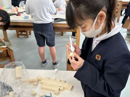 昨日は初めて使う「のこぎり」に少し恐る恐る使用している感じでしたが、扱いが少し慣れてきたようで、今日はどんどん木材を切り刻んでいました。どうすればすっと木が切れるのか、コツも分かってきたようです。細かく切った木材を組み合わせて、もう接着している子もいました。