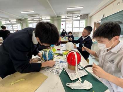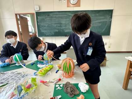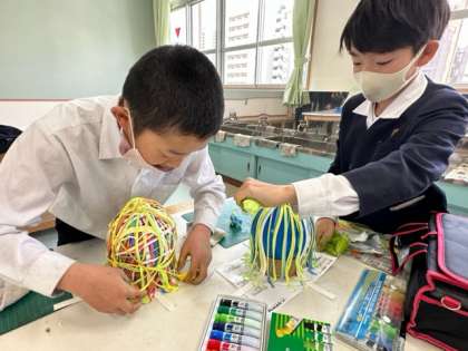 風船で型をつくり、その上に紙粘土を細く伸ばしたものをはりつけていきます。びよーんとのびる粘土の感触を楽しみながら制作していました。みんなで和気あいあいと楽しく活動していきました。こうやってみんなで一緒に活動できるのもあと少しですね!
