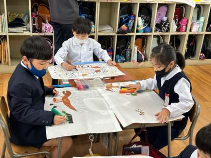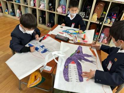 今日の図画工作の時間は作品バックに思い思いの絵を描いていきました。