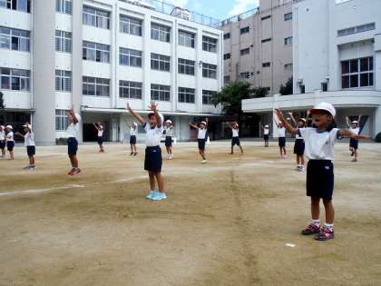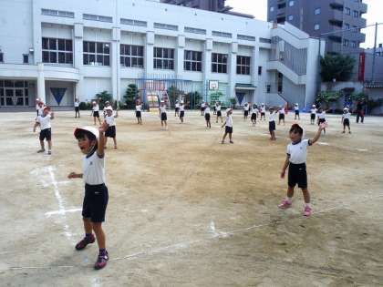 1年生と2年生の運動会の練習です。「豊崎ハピネス!〜みんなでジョイ!ジョイ!〜」(ダンス)を通して練習した後,団体競技の「しっぽを ねらえ!」の練習もしました。元気のよいかけ声のもと,しっぽを取られないよう走っていました。