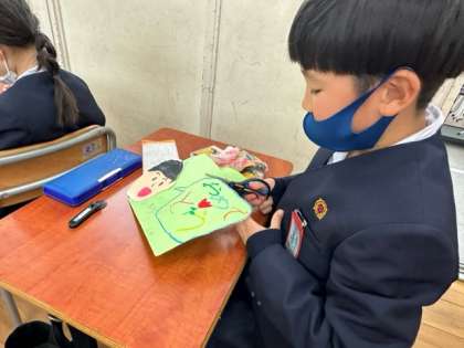 似顔絵を画用紙に貼って、メッセージを書いて切っていきました。ハサミの使い方もとても上手になりました♪