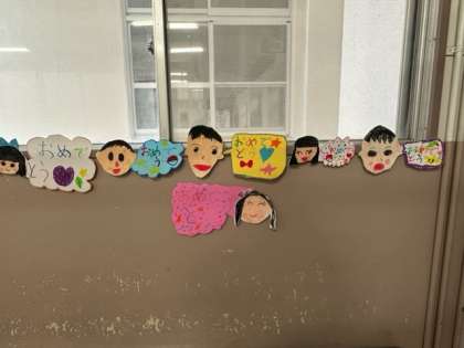 廊下に素敵なメッセージが貼っています。6年生も新1年生にも「おめでとう」の気持ちが伝わるといいですね。