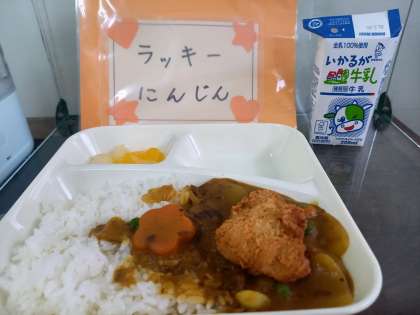 「カツカレーライス」には、給食調理員さんが子どもたちのために用意してくれた花形や星形の「ラッキーにんじん」入りです!