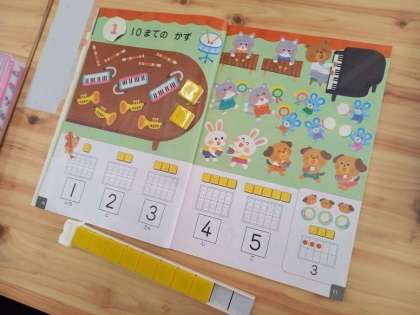 教科書に載っている挿し絵や数図ブロックを使って、10までのかずについて学んでいきます。