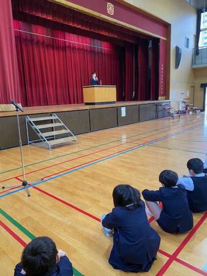 ?月曜日の朝は、全校朝会があります。校長先生から、新校舎の広い廊下を活用して読書スペースを設けるお話がありました。ヨシタケシンスケさんや手塚治虫さんの本を、今日から自由に読むことができます。本が好きな子が増えてほしいですね!