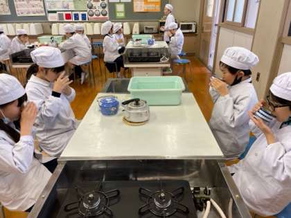 今日はガスコンロの使い方の学習を兼ねて、家庭科室でお茶を淹れてみましたよ!緑茶だけでなく、社会でこれから勉強する沖縄でよく飲まれるさんぴん茶と、タイの国のお茶の3種類を飲み比べてみました。どれが一番おいしかったかな?