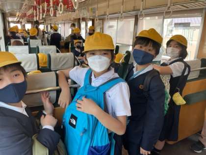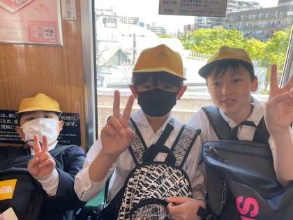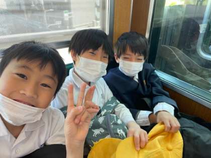 阪急電車の十三駅に着くまで、車内が少しすいていたのでみんなの笑顔をパチリ!
