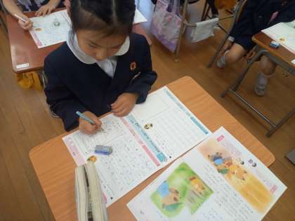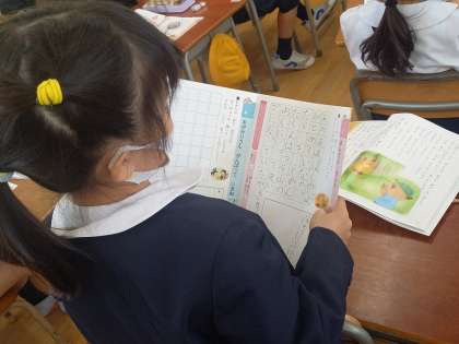 教科書とノートを使い、身近なことを題材にしたお話を読み、自分自身が思ったことや考えたことをクラスで交流しながら、これから人として成長していくために必要なことを学んでいきます。