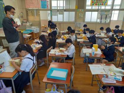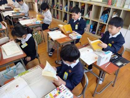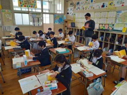 とても分厚い「国語辞典」をどのように使っていけばよいのか、ほとんどの子が「国語辞典」にふれるのは初めてということで、担任の先生が丁寧に説明をしながら、さっそく国語辞典を使って言葉を調べてみました。