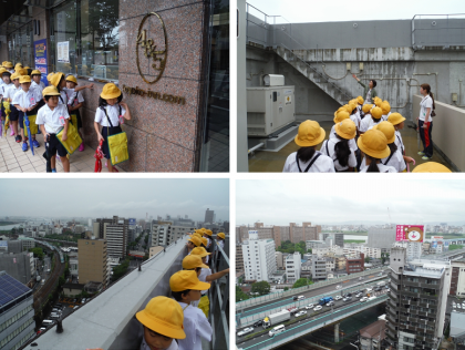 2年生が,まちたんけんで東横インに行きました。まずは屋上を見学させてもらいました。豊崎のまちや淀川,六甲山,伊丹空港に着陸する飛行機なども見えました。