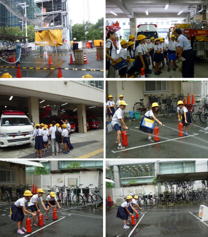 また,レスキュー隊の方がロープを渡るところも見せていただき,かっこいい隊員の方の姿も見られました。その後,子どもたちは「水消火器」での消火体験をして,楽しく学ぶことができました。
