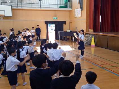 豊崎小学校では、月に1回、児童集会の時間を使って「おたんじょう日集会」が開かれています。