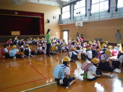 折しも台風18号が近畿地方に接近するのではないかと思われた日でした。集団下校する午後には晴れ間が見えていましたが,大雨のときに注意すべきことを,子どもたちはしっかりと聴いていました。