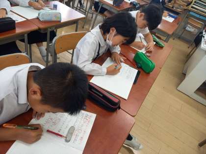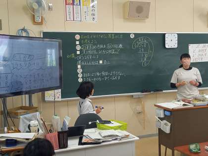 かけ算に比べると苦手意識を持つ子が多い「わり算」ですが、子どもたち自身がしっかりと考えて解き進めることができるよう、先生が丁寧に指導を行っています。
