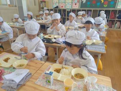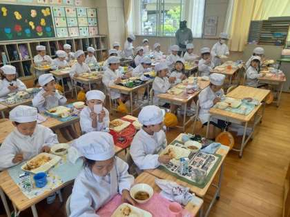 沖縄で人気の料理で、給食では、牛ひき肉、豚ひき肉、たまねぎなどをいためて味付けし、ごはんと混ぜ合わせて食べます。子どもたちからも大好評のメニューです!