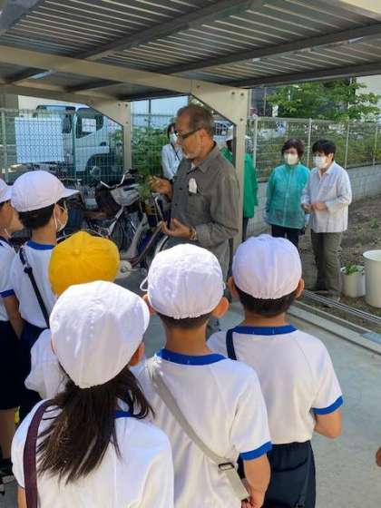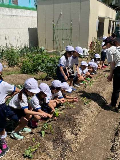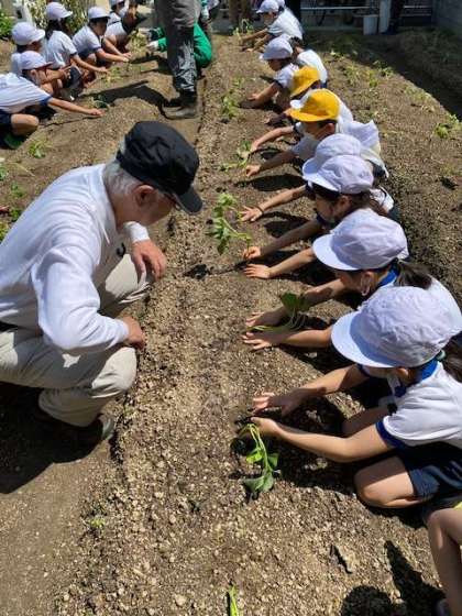 今日は2年生が、豊崎福祉会館の畑にさつまいもの苗植えを体験しに行きました。