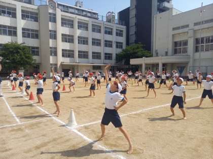5年生・6年生は、運動場で団体演技の練習を行いました。