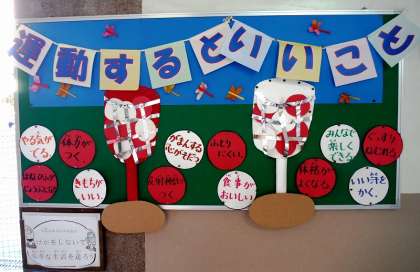保健室前の掲示物です。「運動するといいこと」がたくさん掲示されています。