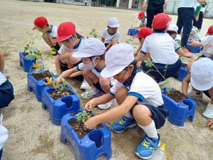 2年生は先日の「さつまいもの苗植え」に続いて、今日は「ミニトマト」の苗植えをしました。