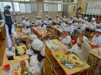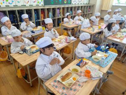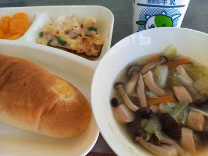 「おさつパン」には、さつまいものダイスが入っており、ほんのり甘くやわらかな食感のパンです。食べやすく、こちらも子どもたちから人気のあるメニューです。
