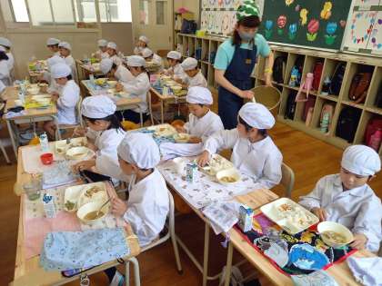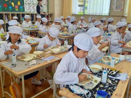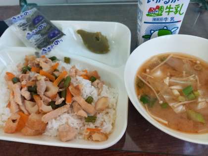 「かやくごはん」の具材は給食室で調理し、給食業者から搬入されている白ご飯と混ぜ合わせていただきます。