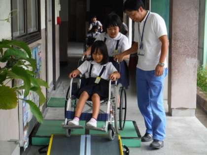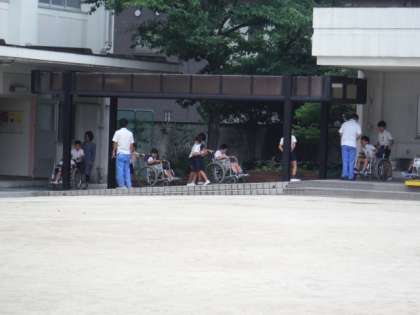 車いす体験をしました。自分で走行し、車いすは少しの段差も走行しにくいことがわかりました。また、介助体験では乗っている人が恐怖を感じないように「曲がるよ」や「ちょっと止まるよ」など声をかけることが大切だということを教わりました。