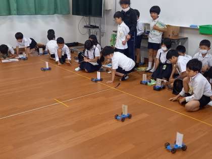 1人1人が作った「車」に送風機の風を当てると、車は前に進みますが人によってその走行距離には差が出ました。同じ材料を使って作ったはずですが、差が出たのはなぜなんでしょうか…?