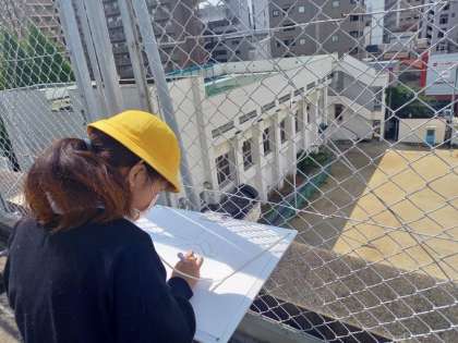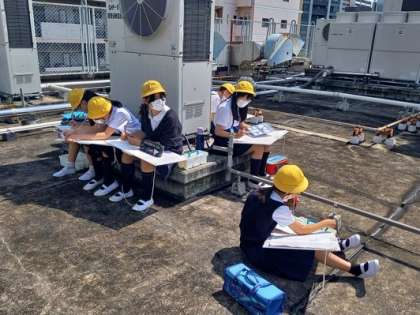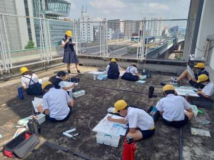 6年生は今日の図画工作の時間に、屋上からの景色を絵に描き表す学習を行いました。