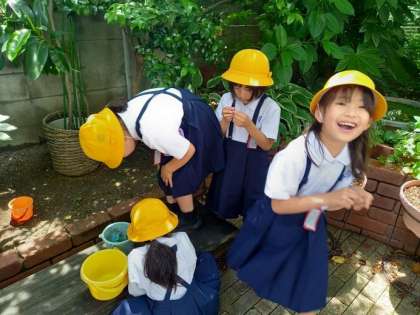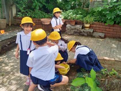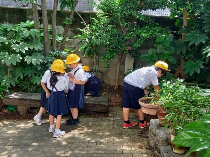 休み時間に、1年生の子どもたちが運動場のわきで熱心に「なにか」をさがしていました。