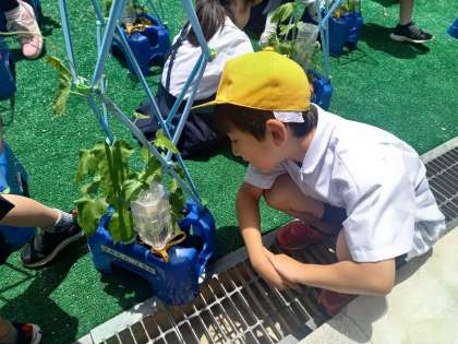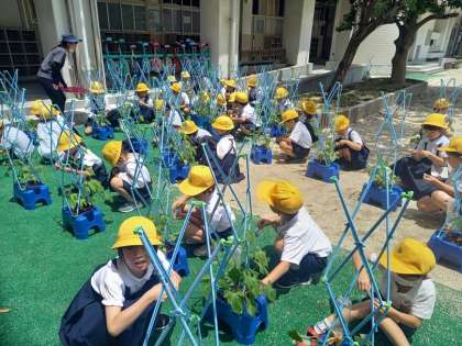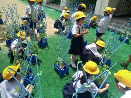 いつも元気な1年生が今日はアサガオの観察をしています。4月に植えたアサガオも大きく成長してきました。毎日丁寧に水やりやお世話をしてきた成果です。
