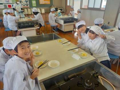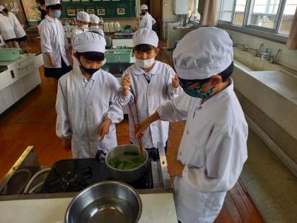 「じゃがいも」の調理では、表面がでこぼこした「じゃがいも」の皮をピーラーでむいていくのが難しく、「ほうれん草」の調理ではゆがくことによって「アク」をとることを学びました。