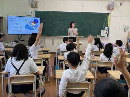 堀川小学校から先生が来られ、五年生に向けて睡眠と朝ご飯の大切さや栄養素のお話しをして下さいました。