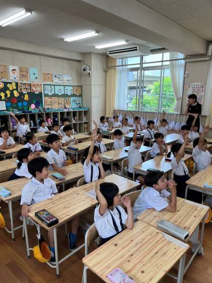 栄養指導の先生にお越し頂き、1年生は給食について学びました。どんな風に、何人で、またどんな道具で給食を作っているのか栄養教諭の先生から紹介があると、1年生からは大きな歓声があがっていました。予想外に大きなお鍋、びっくりするぐらいの量の食材、実は200人以上分をたった二人の調理員さんで作っていることなど、初めて知ることがたくさんあったようです。