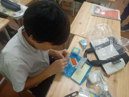 今日は「お裁縫」初日ということで、裁縫箱に入っている用具の使い方や注意点など、先生のお話をしっかりと聞きながら、用具の確認をしました。