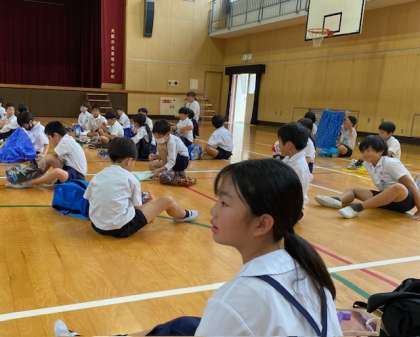 明日から始まる水泳の学習に向けて、3・4年生が、持ち物の確認や並び方、バディの確認をしていました。