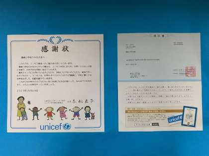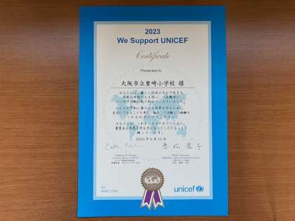 先日、児童会を中心に行ったユニセフ募金の取組みに、日本ユニセフ協会から感謝状が届きました。