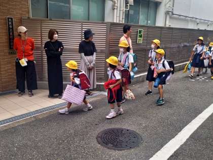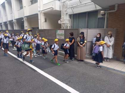 子どもたちの登校時には、たくさんの保護者のみなさま、地域のみなさまが集団登校に付き添っていただいています。おかげさまで、子どもたちは毎日、安心して学校に通うことができています。いつも本当にありがとうございます。