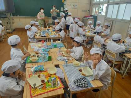 1年生の教室では、最初、お減らしをした子も、実際に「なすのミートグラタン」食べてみて、