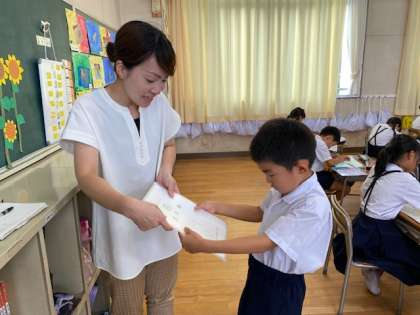 各クラスで通知票が一人一人に手渡されていました。担任の先生から、1学期頑張ったところや伸ばしていってほしいところなどを伝えられ、みんな真剣な表情で聞いていました。