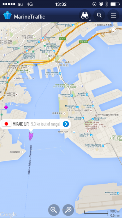 「Miraie」で検索をすれば,帆船「みらいへ」の現在位置や進路,航跡などがわかります。
