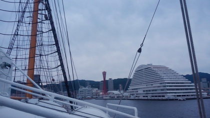 神戸港を母校にしている帆船「みらいへ」は,修学旅行の乗船場所である大阪港へ向けて出港しました。
