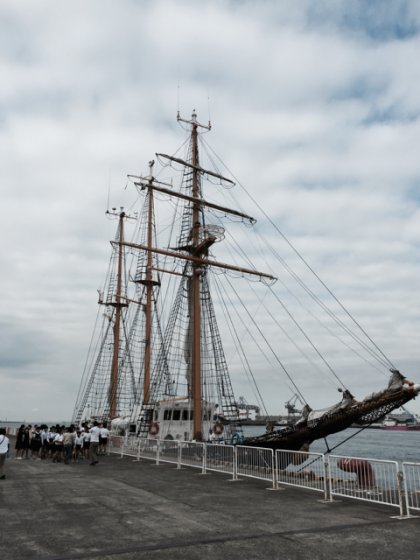 大阪港に到着しました。帆船を前にしてわくわくする子どもたち。
