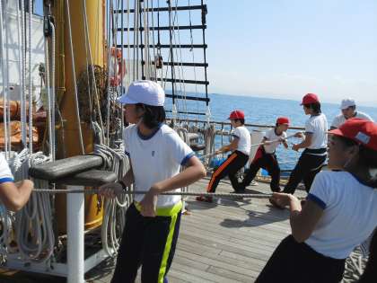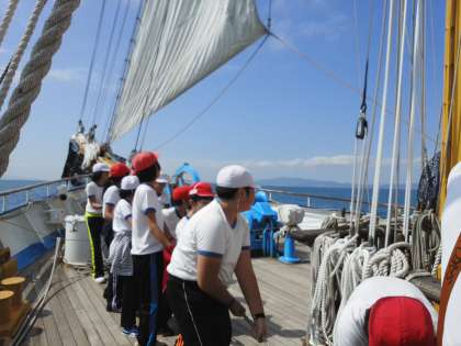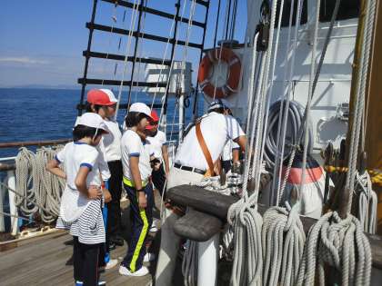 5枚の帆を張りました。かけ声はまだまだ小さいです。デッキに広がったロープをかたづけます。