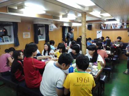 メスルーム (食堂)はちょうど1クラスで満席です。煮込みハンバーグ、 グラタン、みそ汁、ポテトサラダ、ひじきと豆の煮物です。おいしくいただいています。