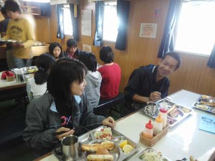 ベーコン、炒り卵、サラダ、3種類のパン、リンゴかオレンジのジュース、グレープフルーツを各自食べられる量を取り分けていただきました。